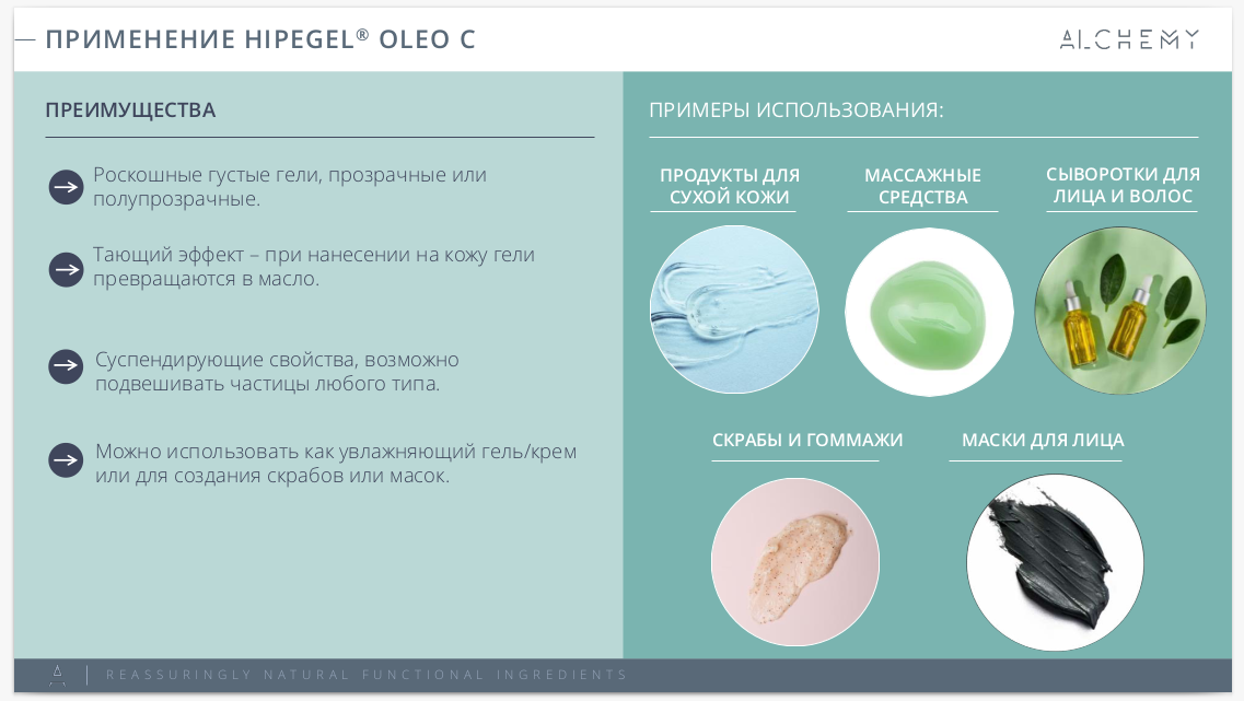 Hipegel® Oleo C идеально подходит для различных косметических продуктов, таких как питательные средства для кожи (гели, сыворотки), очищающие средства (бальзамы, гель-молочко), маски и скрабы, массажные продукты (масла, гели), масла для волос, а также натуральные блески и бальзамы для губ.